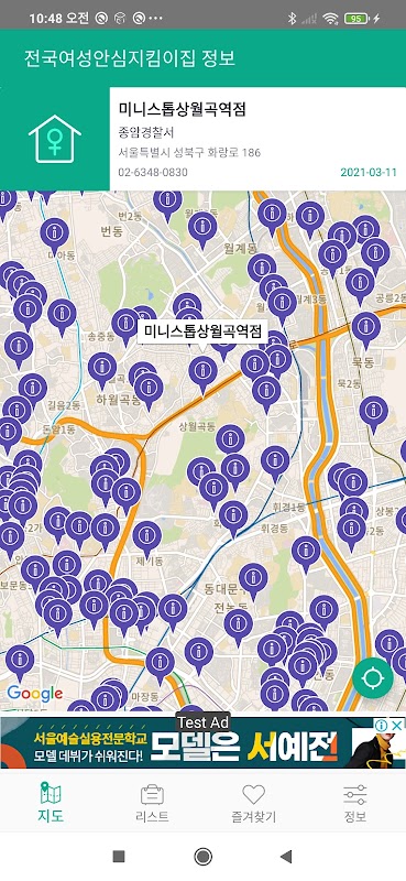 ** 내 위치를 기준으로, 여성안심지킴이집의 위치를 거리순으로 확인 할 수 있습니다.