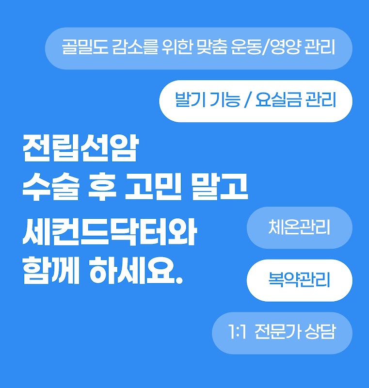전립선암 by 세컨드 닥터는 암 수술 후 빠른 회복과 삶의 질 향상을 필요로 하는 분들을 위해 만들어진 개인 맞춤형 전문 건강관리 솔루션입니다.