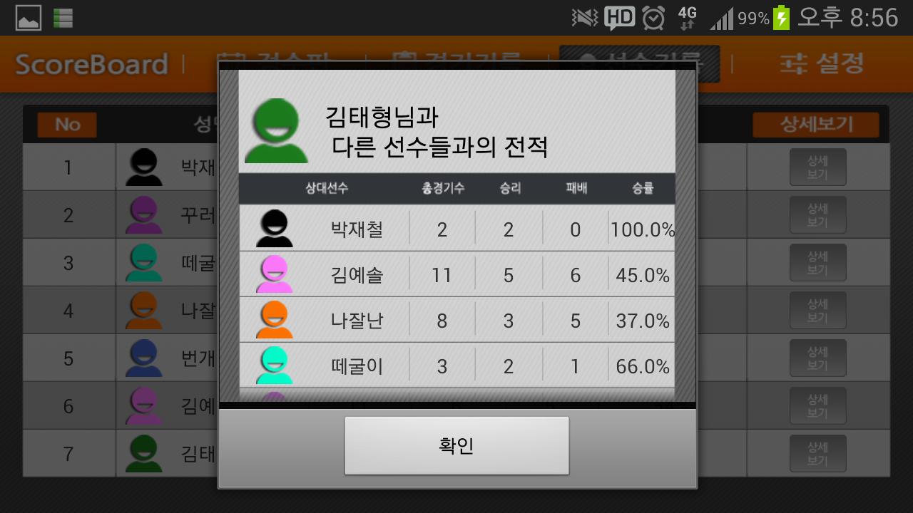 경기에 참여할 선수들을 등록할 수 있습니다. 점수판에서 한눈에 확인할 수 있도록 각 선수는 원하는 색깔의 아이콘을 선택할 수 있습니다. 색깔을 통해 한 눈에 선수상황을 볼 수 있습니다.
