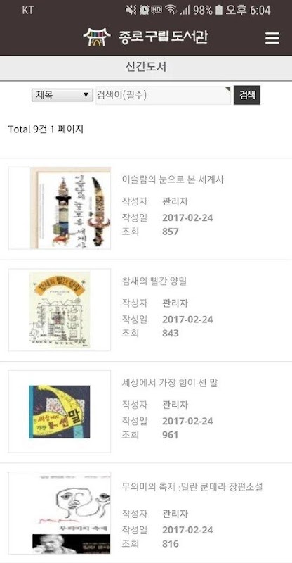 * 서비스내용: 도서검색, 모바일회원증, 도서관 안내, 전자책, 대출현황 및 이력 등