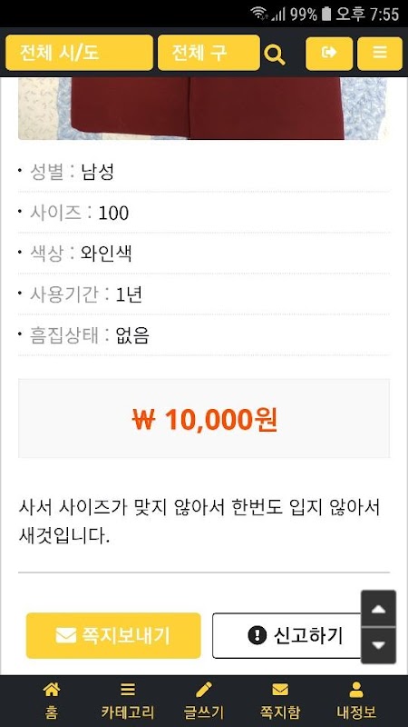 이러한 단점을 보완하고자 거래에 필요한 정보를 필수적으로 입력하여 거래간의 불필요한 대화를 줄이며 거래시간을 단축하는 최고의 중고패션용품앱입니다.