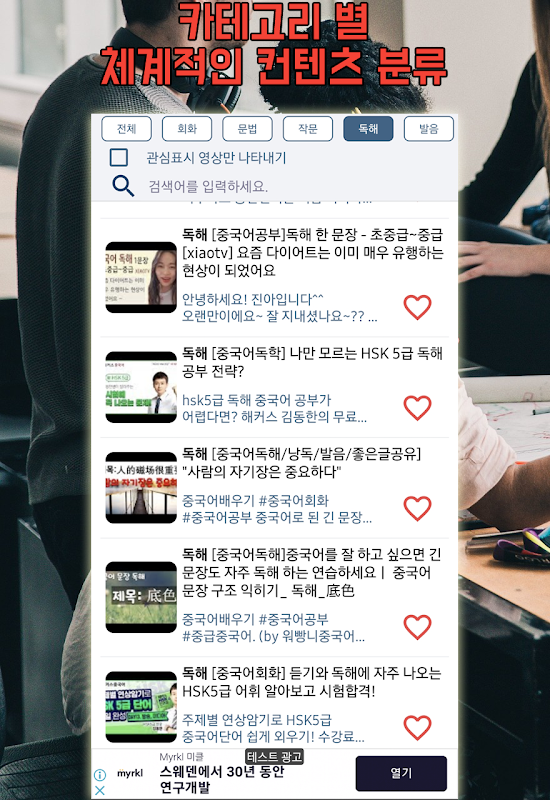 중국어 공부 ( "회화", "문법", "작문", "독해", "발음", "단어", "듣기", "HSK")에 대한 양질의 컨텐츠를 자유롭게 조회하세요.