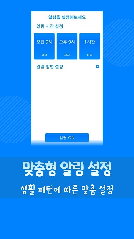 여러분의 생활 패턴에 따라 알림 시간과 주기를 설정할 수 있습니다.