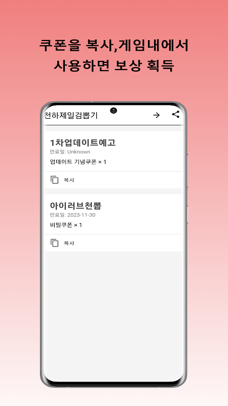 나만 못 쓴 쿠폰 만료되기 전에 사용하세요. "천하제일검뽑기"의 쿠폰 정보를 보여주고 신규 쿠폰 발행되면 푸시 알림을 받을 수 있습니다.