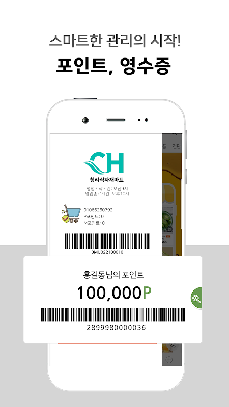 - 청라식자재마트의 포인트 카드를 모바일로 편리하게 이용하시고, 언제 어디서든 포인트를 확인하실 수 있습니다.