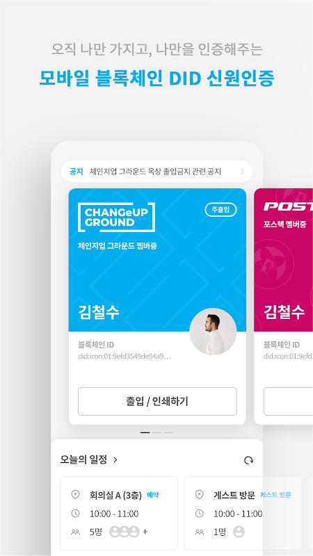체인지업그라운드 스마트 오피스와 포스코 거점 오피스 출입 앱입니다.