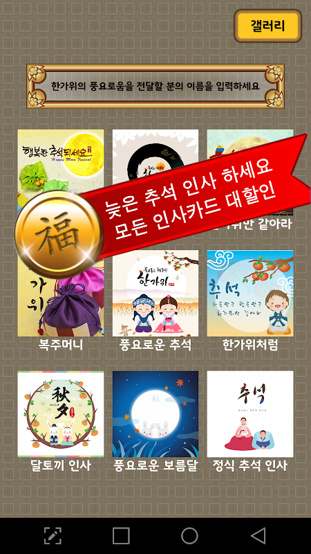 뒤늦은 추석인사를 하실 수 있도록 대할인 진행합니다. 모든 인사카드를 90% 이상 할인합니다. 많은 이용 부탁드립니다