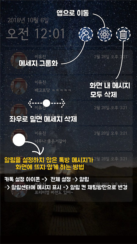 카톡의 마지막 메시지뿐만 아니라, 모든 카톡들이 앱 화면에 쌓여 카톡을 열지 않고 미리 메시지 내용을 확인할 수 있습니다.