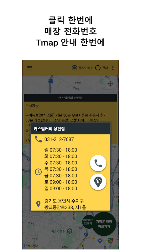 커스텀커피(KustomCoffee) 매장의 주차 정보 및 Tmap안내를 한번의 클릭으로~