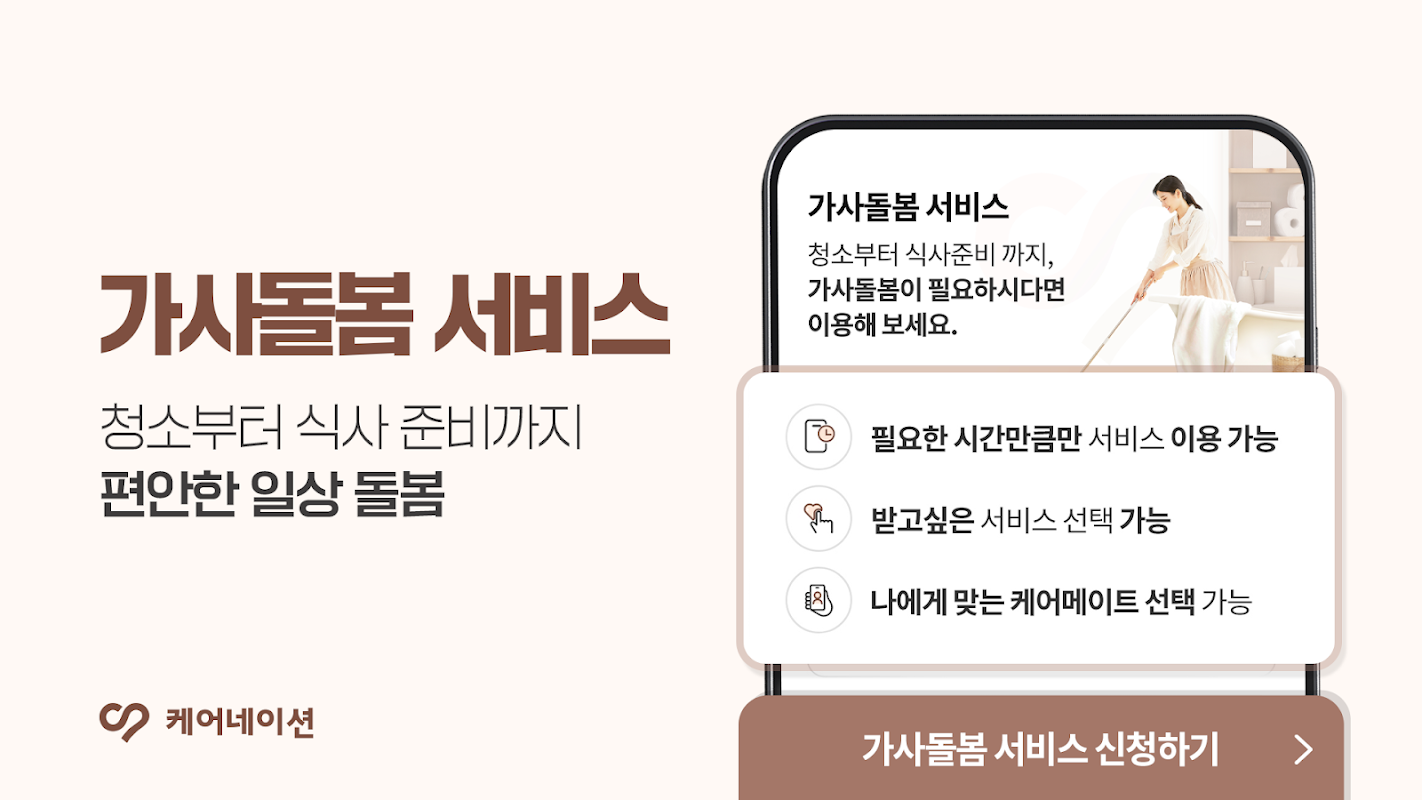 간병이 필요할 때, 프로필과 후기 확인 후 선택하세요. 간병, 동행, 가사돌봄, 산후돌봄까지 돌봄이 필요한 모든 순간, 케어네이션!