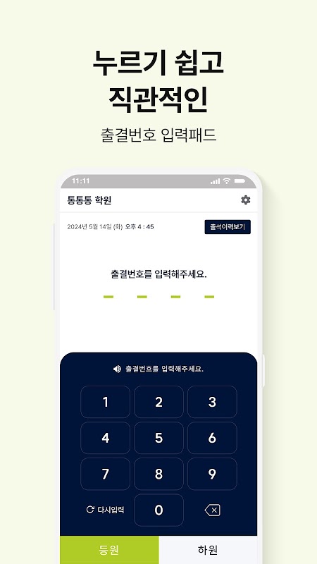 원생이 직접 입력한 출결번호로 등/하원 관리가 쉽고 빠르게 통통통 출결