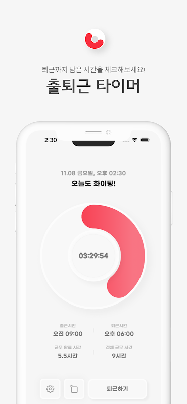 - 근무 시작부터 끝까지, '퇴근타이머'와 함께하세요. 설정된 출근시간부터 퇴근시간까지 남은 시간과 지난 시간을 실시간으로 확인할 수 있어요!