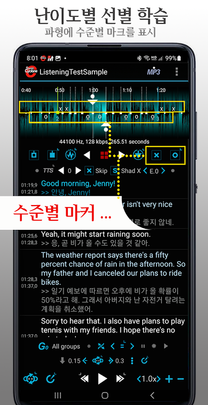 1. 영어학습의 최대 난제인 난청파트(잘 안들리는 문장)는 'O'마크, 최대 요주의 난청파트는 'O_', 스킵하고 싶은 문장 혹은 파트는 'X'마크를 표시하여 필요에 따라 취합하거나 소거하여 집중 구간반복재생학습을 가능케 한 영어반복학습의 최고봉