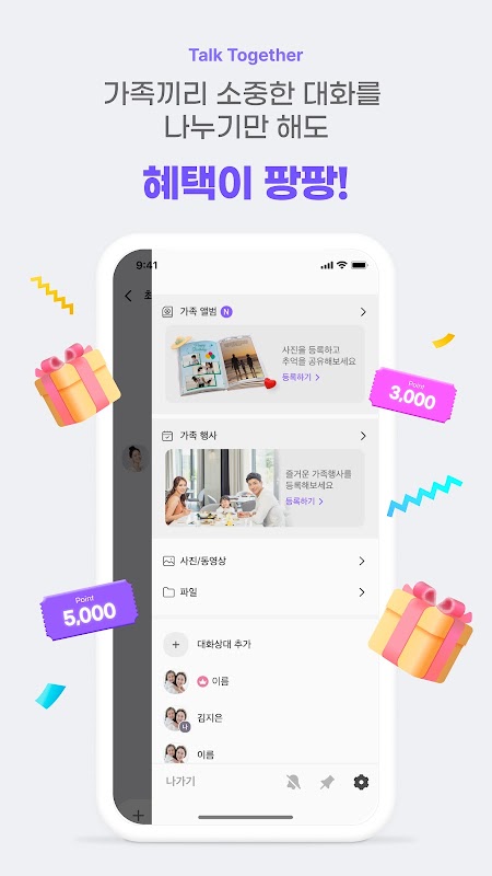 가족대화방: 가족들을 초대하여 대화방을 만들고 호텔 예약, 선물하기, 사진인화등 다양한 헤택도 누리세요.