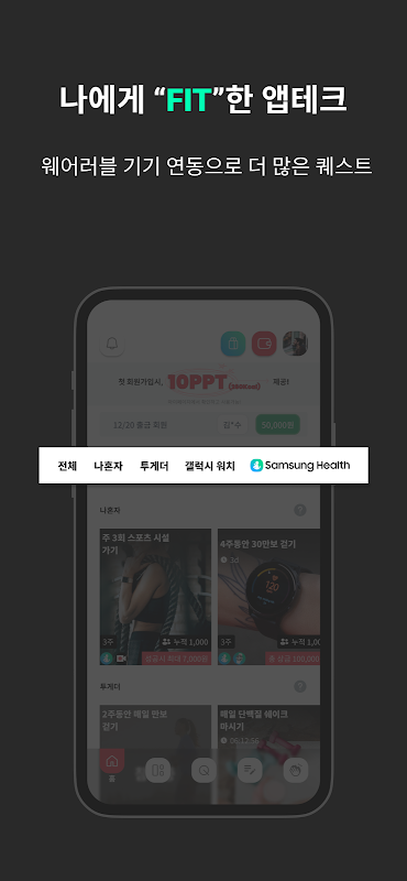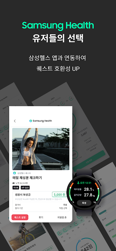 ■ 삼성헬스 퀘스트 : 삼성 헬스의 걸음 수 측정, 심박수 측정, 체성분 측정, 수면 점수 측정 등의 기능을 연동하여 퀘스트를 할 수 있습니다. 또한 갤럭시 워치를 통해서 보다 쉽고 편하게 퀘스트를 즐길 수도 있습니다.