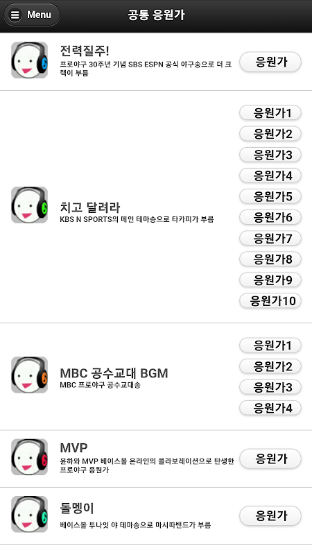 프로야구 응원가에는 10개 구단(두산 베어스, LG 트윈스, 롯데 자이언츠, KIA 타이거즈, 삼성 라이온즈, SSG 랜더스, 한화 이글스, 키움 히어로즈, NC 다이노스, kt wiz)의 팀 응원가, 선수 응원가, 선수 등장곡이 포함되어 있으며, 공통응원가, 레전드응원가, 추억의응원가, 군입대선수 응원가도 들을 수 있답니다. 선수검색으로 응원가를 쉽게 찾을 수 있으며, 설정의 음원 반복 재생으로 응원가를 쉽게 배울 수 있습니다.