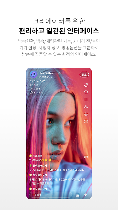 새로워진 플렉스캐스터는 쉽고 편리한 화면 구성으로 방송을 더 스마트하게 진행 가능해요.