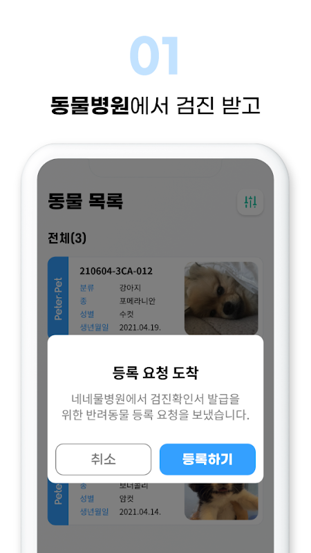 예방접종과 건강검진 내역을 수의사가 서명한 검진확인서로 조회하고 생체인식으로 인식하는 강아지 안심입양 솔루션!