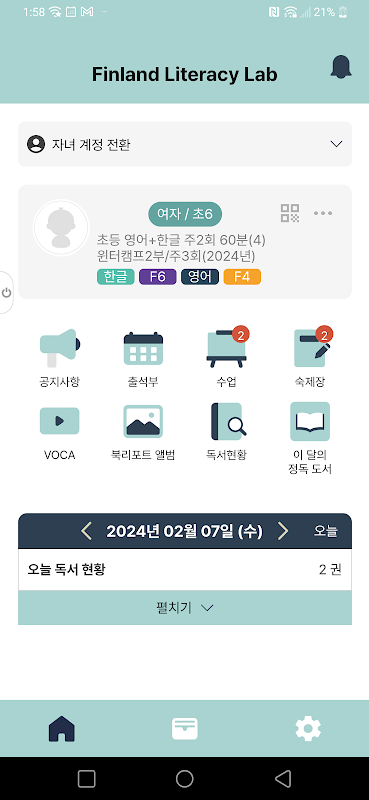 3. 우리 아이의 일별/누적 독서현황과 작성 북리포트를 확인할 수 있습니다.
