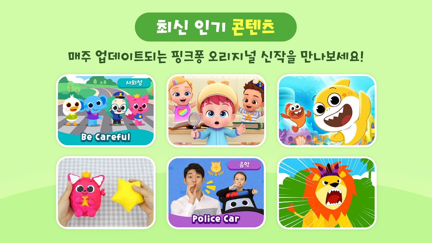 - 핑크퐁TV앱에는 유해한 광고가 없어 어린이들에게 100% 안전한 환경을 제공합니다.