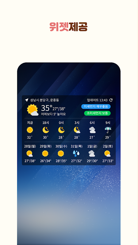 첫화면만 켜면 실시간 날씨, 시간대별 날씨, 주간 날씨에 실시간 미세먼지, 미세먼지 예보까지
