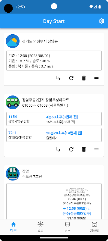 하루를 시작하는 앱입니다. 날씨, 버스도착, 지하철 시간을 하나의 앱에서 확인하세요.