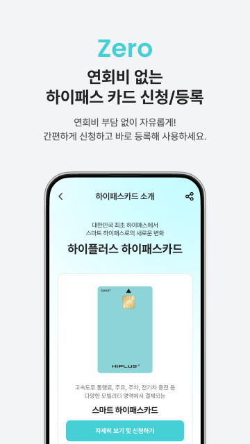 - 하이플러스의 스마트 하이패스카드로 연회비 없이 빠르고 간편하게 신청/ 등록하세요.