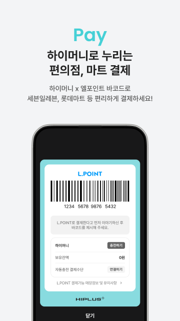 - 하이머니와 엘포인트를 연동하시면 롯데백화점/마트/면세점/리아/세븐일레븐 등 다양한 가맹점에서 바코드로 결제할 수 있어요.