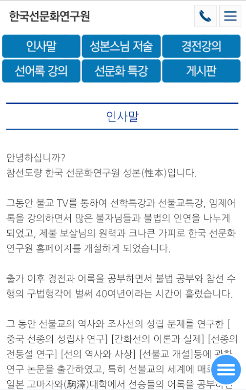 그동안 불교 TV를 통하여 선학특강과 선불교특강, 임제어록을 강의하면서 많은 불자님들과 불법의 인연을 나누게 되었고, 제불 보살님의 원력과 크나큰 가피로 한국 선문화연구원 홈페이지를 개설하게 되었습니다.