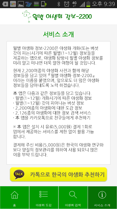 ※ 本 앱은 야생화를 사랑하시는 분들을 위하여 모든 서비스를 무료로 제공하오니 많은 이용을 바라며, 아울러 주위분들께도 적극적인 추천을 부탁 드립니다.