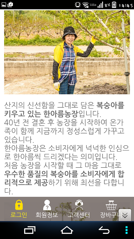 01. 산지의 신선함을 그대로 담은 복숭아를 키우고 있는 한아름농장입니다. 40년 전 결혼 후 농장을 시작하여 온가족이 함께 지금까지 정성스럽게 가꾸고 있습니다. 한아름농장은 소비자에게 넉넉한 인심으로 한아름씩 드리겠다는 의미입니다. 처음 농장을 시작할 때 그 마음 그대로 우수한 품질의 복숭아를 소비자에게 합리적으로 제공하기 위해 최선을 다합니다.