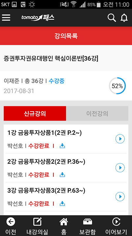 - 이어보기: 한번 터치로 직전에 수강했던 강의부분부터 자동으로 이어서 수강가능.
