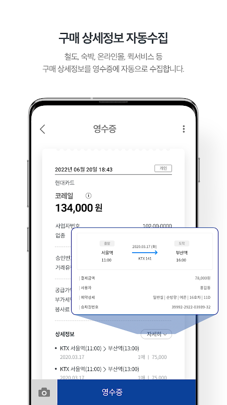 자동 수집된 법인카드 영수증과 기타간이(현금) 영수증, PC에서 수집한 개인카드 영수증, 티머니카드 영수증, 제로페이 영수증까지! 이제는 비즈플레이 모바일로 간편하게 경비처리 하세요!