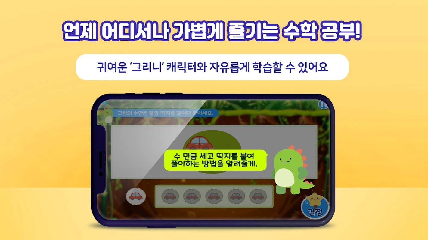귀여운 '그리니'가 수학 여행 길잡이가 되어 꾸준한 학습을 도와줘요.