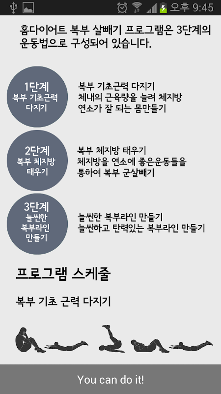 운동전후 스트레칭과 운동을 복부 기초근력 다지기(체험판), 복부 체지방 태우기(정식버전), 날씬한 복부라인 만들기(정식버전) 3가지의 단계로 운동을 구분하였고 사용자가 원하는 운동을 선택할수 있으며 운동시 자세설명은 물론 어플의 카운팅소리와함께 운동할수있습니다.