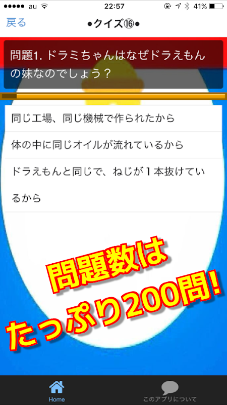 ・問題数は漫画・アニメからのクイズが170問、秘密道具クイズが30問の各10問ずつで、合計200問です。