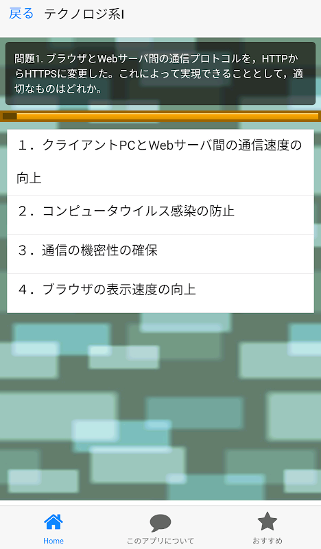 국가 시험 "IT 패스포트」의 2016 년 봄 시험 문제에서 발췌 한 버전입니다.설문 수를 굳이 줄여 작은 통근 통학 등의 틈새를 활용 해 간편하게 학습 할 수 있습니다.