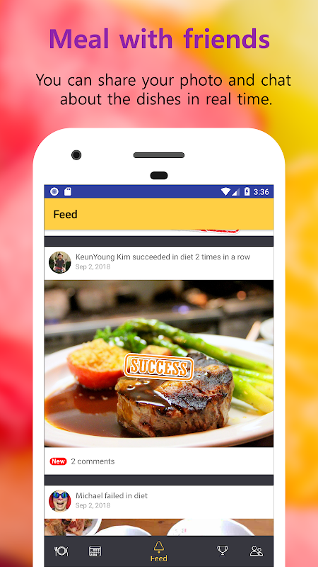 식사중인 친구에게 힘내라고 응원의 메세지를 보내주세요. 친구들의 응원이 힘이되어 보다 적은양의 음식을 먹도록 도와줍니다. 또한 서로의 식단에 대한 궁금증이나 솔직한 의견을 교환할 수도 있습니다.