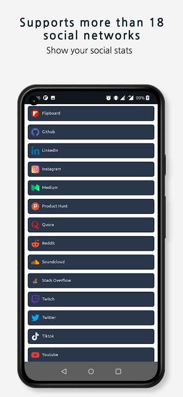 1Profile은 Facebook, Instagram, Twitter, youtube를 포함한 18개 이상의 소셜 네트워크를 지원합니다. 소셜 프로필을 추가할 뿐만 아니라 페이지에 팔로어 수, 구독자 수 등과 같은 소셜 프로필 통계를 표시하도록 설정할 수도 있습니다.