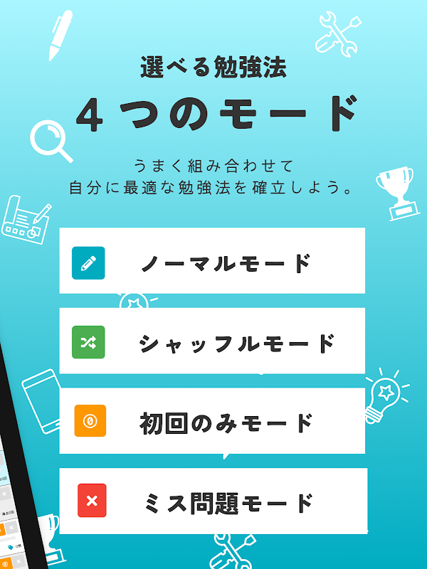 ・「셔플 모드」는, 출제 문제는 노멀 모드와 같습니다만, 출제되는 순서가 랜덤이 됩니다. 대답을 문제의 순서로 기억해 버리는 것을 막습니다.