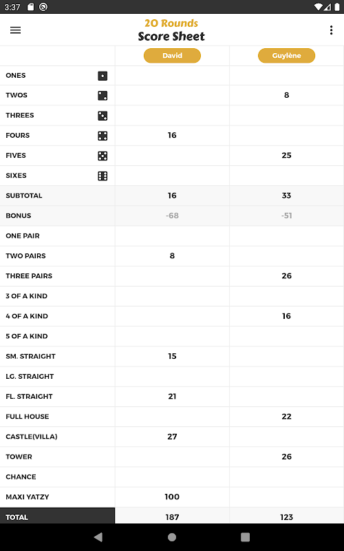 Maxi Yatzy 게임의 결과를 기록하는 가장 좋은 응용 프로그램입니다.