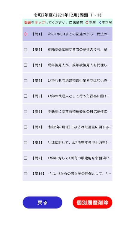 레이와 3년(2021년)까지의 5년간의 과거문을 수록하고 있습니다. 문제를 풀면 정답·부정해를 바로 알 수 있고, 이력이 남습니다. 간편하게 과거 질문을 확인할 수 있습니다.