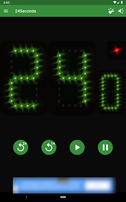 실제 농구에서 사용하는 24초 샷 클락. 14초 리셋, 큰 버저 소리.