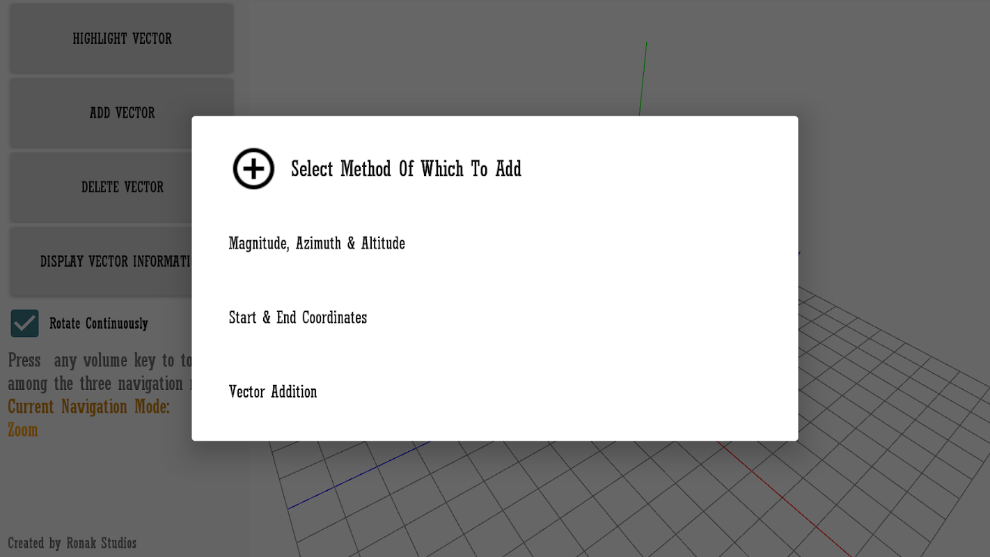 이 응용 프로그램의 그래프는 OpenGL을 사용하여 방위각 고도 진도 시스템을 사용하여 벡터를 추가합니다. 응용 프로그램은 또한 당신이 이제까지 각 벡터에 대해 알아야하는 모든 정보를 제공합니다. 주 : 방위각은 X 축을 중심으로 반 시계 방향이며, 고도의 z 축을 중심으로 시계 반대 방향이다. 고도는 벡터의 고도의 역이다.