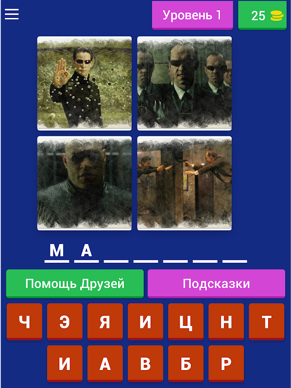 Правила максимально просты: По 4 картинкам (кадрам из фильма) нужно отгадать объединяющее слово (название фильма). Посмотрите на картинки – проведите аналогию и угадайте фильм. Если вы застряли на каком-то уровне – не беда, используйте подсказки "Удалить ненужные буквы", "Вставить правильную букву" или "Пропустить уровень".
