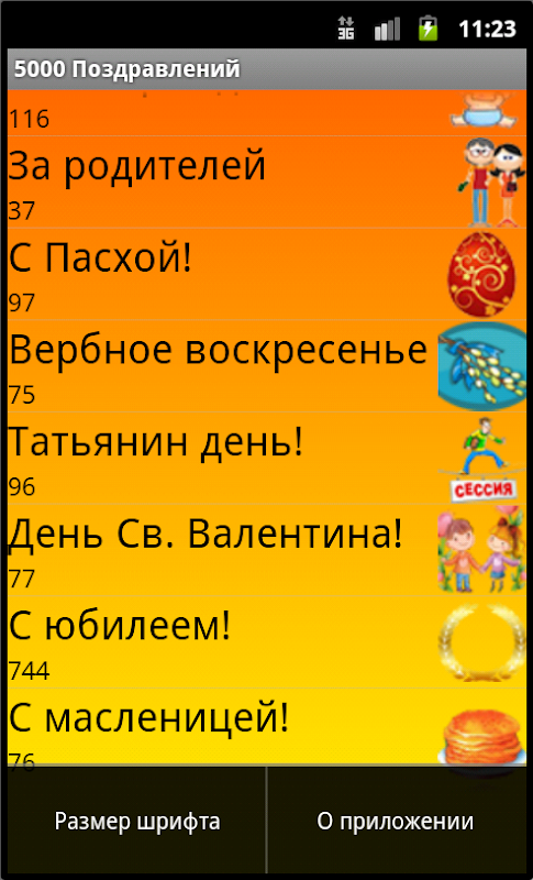 Не знаете как поздравить друга с праздником? Думаете как поздравить маму с днём рождения? Поздравляете родственников с Новым 2019 Годом? Хотите поздравить ребёнка с днём знаний?В этом приложении вы найдёте поздравление на любой праздник! Скачивайте это приложение и у вас в телефоне всегда будет более 10000 свежих, интересных и весёлых поздравлений!