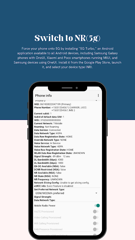 OneUI를 사용하는 Samsung Galaxy 휴대폰, MIUI를 사용하는 Xiaomi 및 Poco 스마트폰, OneUI를 사용하는 Samsung 장치를 포함한 모든 Android 장치에서 사용할 수 있는 Android 애플리케이션인 "5G Turbo"를 다운로드하여 휴대폰을 5G로 강제 전환하세요. Google Play 스토어에서 다운로드하고 실행한 후 기기 유형 5G(NR)을 선택하세요.