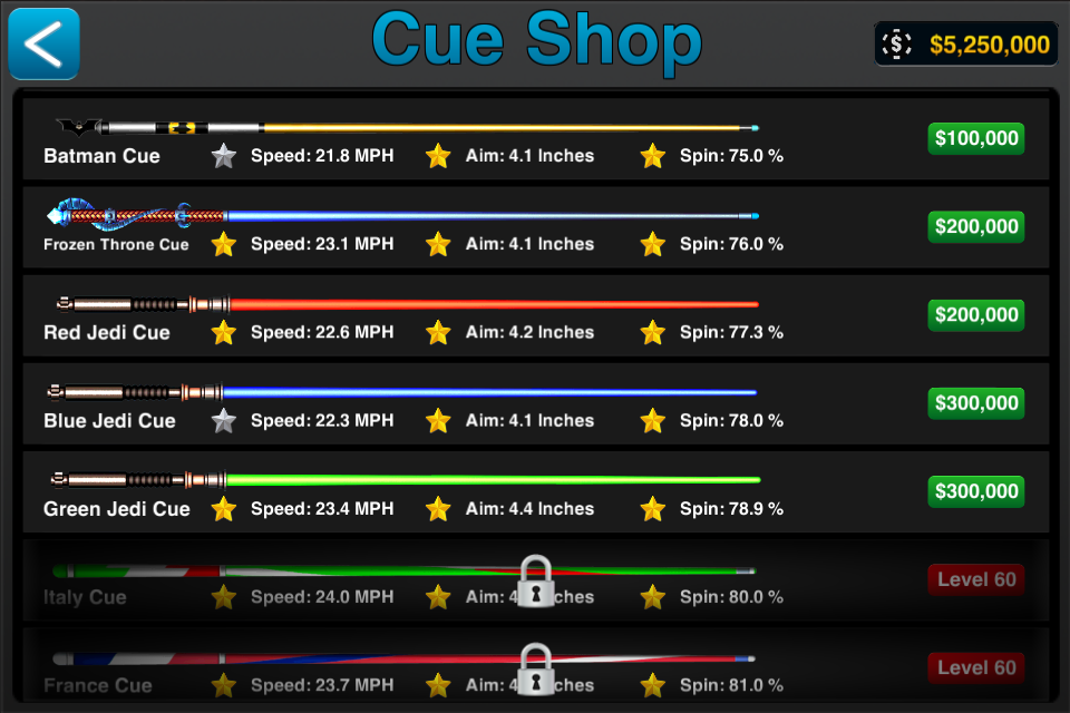 When you level up, you automatically unlock more items. High level cues possess more power, longer extension line and more spin. High level avatars are always wayyy cooler and cost very little chips to get. Purchase these items to gain an edge on your opponent and show your flares!