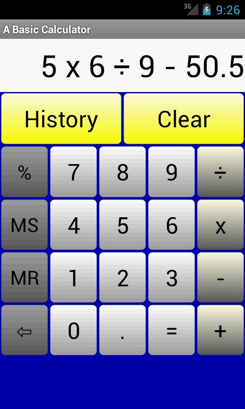 아무데 간단한 - 투 - 사용, 읽기 쉬운 계산기는 휴대 전화로갑니다. 또한, 뺄셈, 곱셈, 분열과 퍼센트 - 모두 기본적인 기능을 수행합니다. 모든 종과 경적에서 제거,이 계산기는 이름에서 내포대로 않습니다 - 그것은 단순히 계산합니다.