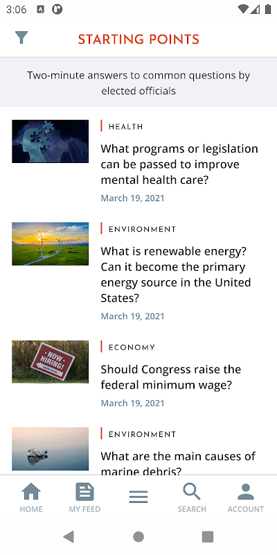 A Starting Point는 필수 정책 문제에 대해 초당적인 관점을 제시하는 독립적인 시민 참여 플랫폼입니다. 우리 앱은 '시작점'이라는 관점을 공유하는 선출직 대표와 정책 전문가의 통찰력을 2분 미만의 간결한 세그먼트로 제공합니다. 우리의 임무는 다양한 정치적 견해에 대한 접근을 촉진함으로써 더 많은 정보를 갖춘 유권자를 육성하는 것입니다.